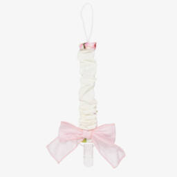Lovely ivory dummy clip for baby girls by Phi Clothing, made in soft poplin with a pink blossom print. Trimmed with a charming bow, it has a secure plastic clip on one end, and an elasticated loop on the other end, ensuring your little one's pacifier stays conveniently within reach.