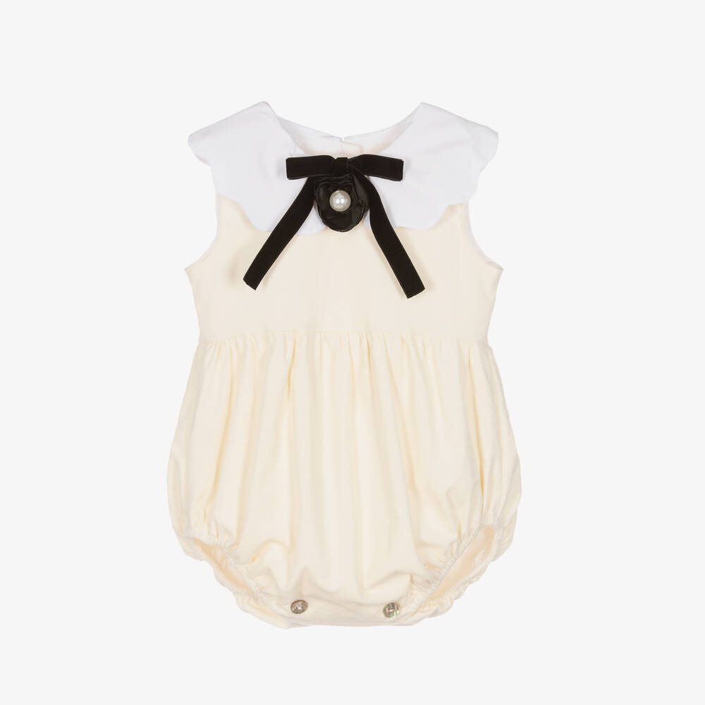 Lovely ivory shortie for baby girls by Phi Clothing, made in soft, lightweight velvet. This pretty shortie has a wide white collar with a scalloped edge and a black velvet bow on the front with a black satin flower and large pearl bead in the centre. Fully lined in soft cotton for comfort, it fastens on the back and between the legs with mother-of-pearl buttons.