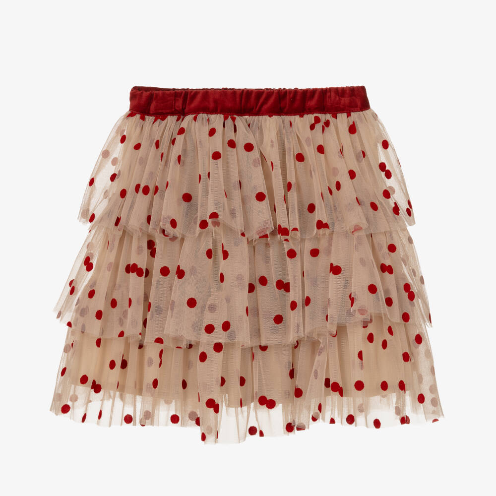 A gorgeous beige skirt for girls by Phi Clothing, made in soft, voluminous layers of tulle. This skirt is patterned in red velvet polka dots and has a matching elasticated waist. There is an adjustable waistband for a lovely fit and a delicate cotton voile lining for comfort.