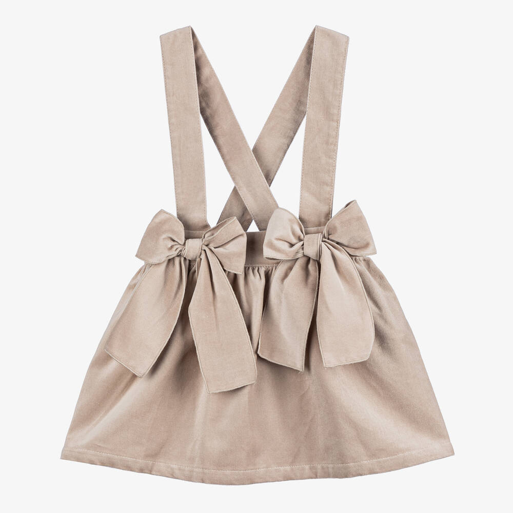 Pretty beige skirt for girls by Phi Clothing, made in beautifully soft cotton velvet. For a romantic look, there are bow appliqués on the waistband. The traditional cross-over straps fasten simply with buttons on the back of the waist.