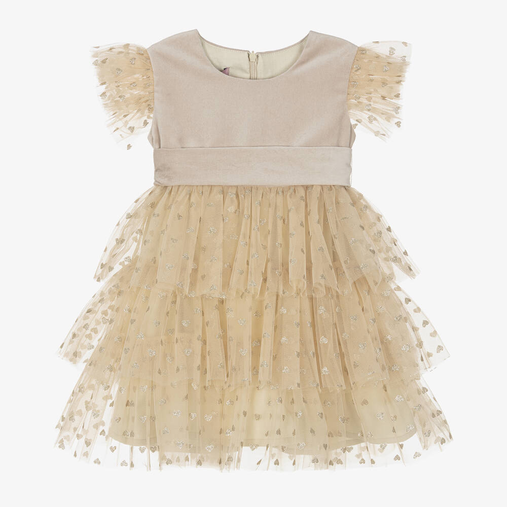Girls Beige Velvet & Tulle Dress