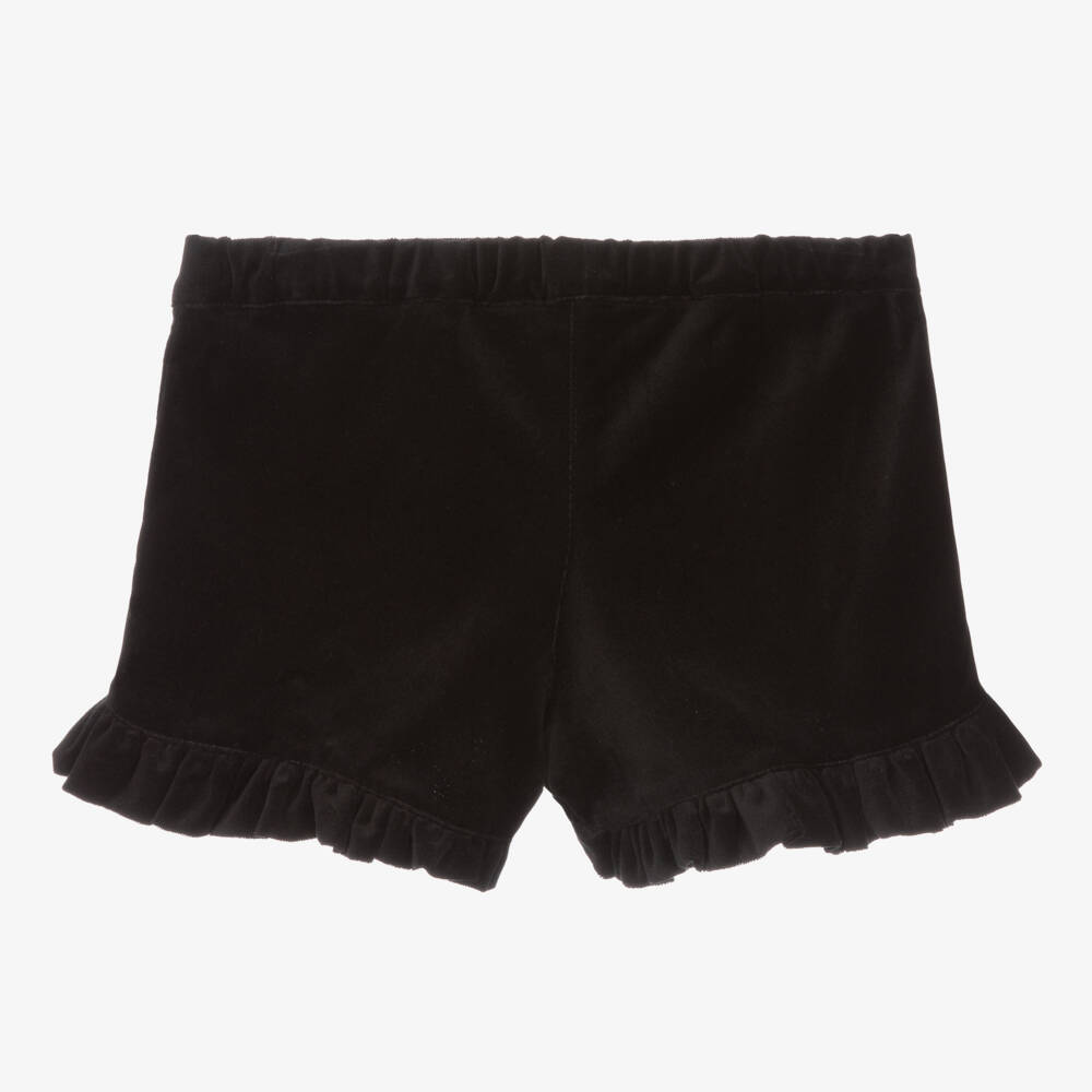 Smart cotton velvet shorts for girls Portuguese brand Phi Clothing, ideal for special occasions. They have front pockets and frilly velvet trims on the cuffs. For a good fit, the waistband is adjustable and elasticated around the back.