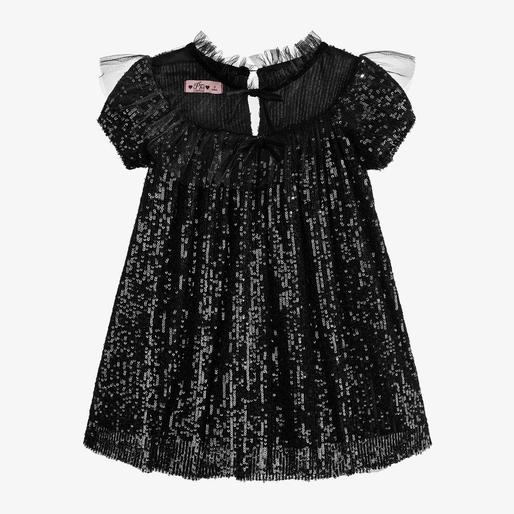 A stunning black, special occasion dress for girls by Phi Clothing, made from stretchy, sequinned tulle for fabulous sparkle. Trimmed with ruffles, this elegant short-sleeved design has a sheer neck panel detailed with velvet bows for a classic finish. It is lined in soft cotton for comfort and fastens with a stylish mother of pearl key-hole button on the back.