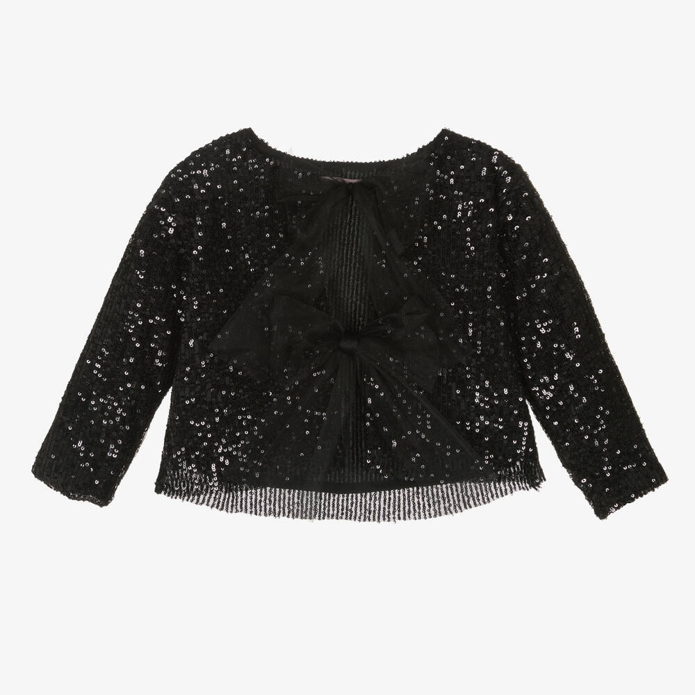 A stunning jacket for girls by Phi Clothing, shimmering in chic black sequins. Lovely for parties, this eye-catching design fastens on the front with black tulle ribbons that tie into fabulous bows. For comfort, it is fully lined in soft cotton.