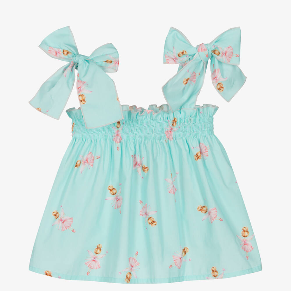 Lovely turquoise blue top for girls by Phi Clothing, woven in lightweight cotton poplin. Patterned with a sweet pink ballerina fairy print all-over, it has a gorgeous shirred panel around the top for comfort. The relaxed flared shape makes this blouse ideal for warm summer days. The shoulder straps beautifully tie into oversized bows, for a romantic finish to this pretty top.