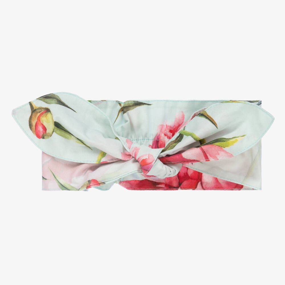 A pretty pale blue headband for girls by Phi Clothing, made in soft cotton poplin. Patterned with a bold pink floral design, this self-tie headband has an elasticated back trim for a comfortable fit.