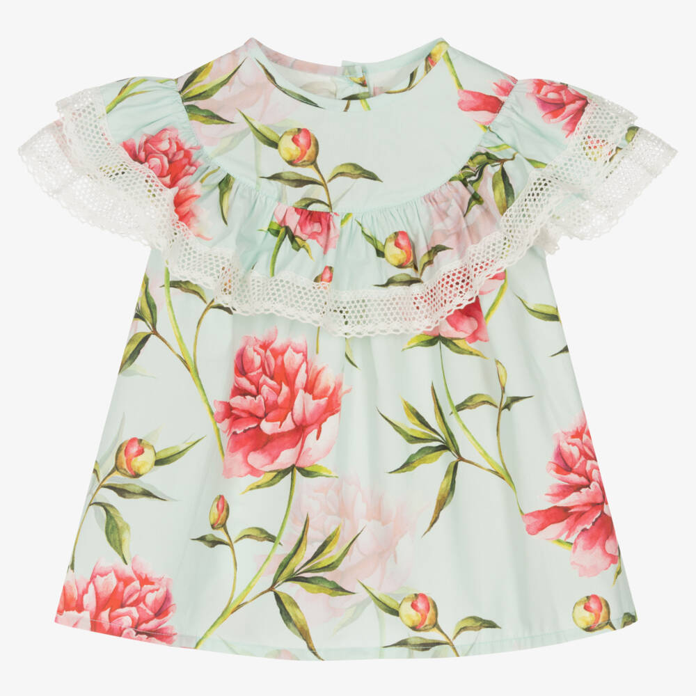 Lovely aqua blue blouse for girls by Phi Clothing, made in lightweight cotton poplin. Patterned in a gorgeous pink floral print, this top has dramatic large ruffle trims across the front and back, trimmed with intricate lace detailing. There is a single button fastening on the back.