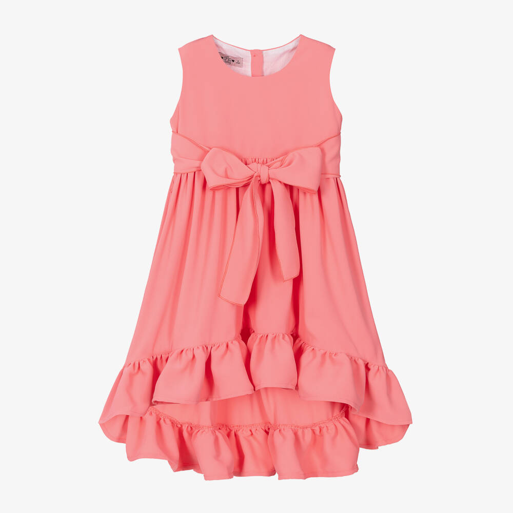 A coral pink sleeveless dress for girls by Portuguese brand Phi Clothing, woven in a soft, smooth fabric. The waistband is gently gathered creating a lovely full skirt, with a frilled hem detailing the stylish dipped hemline. For comfort, the bodice is lined in soft voile, with mother-of-pearl buttons on the back. The dress comes with a detachable sash that can be tied into a bow for a pretty finish.