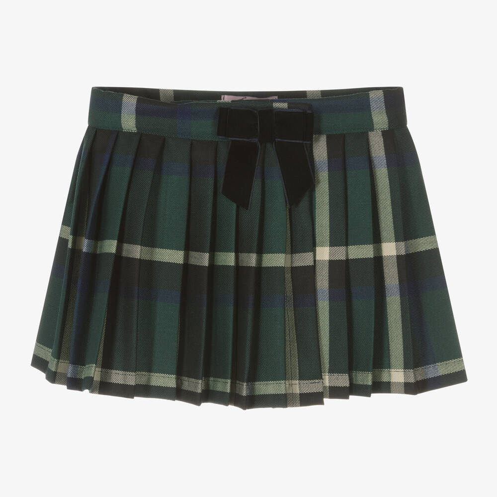A pleated twill skirt for girls by Phi Clothing, in a dark green and navy blue tartan. It has a wrap-style front with concealed buttons on the waist. The waistband is fully adjustable and the blue velvet bow adds a lovely finishing touch.