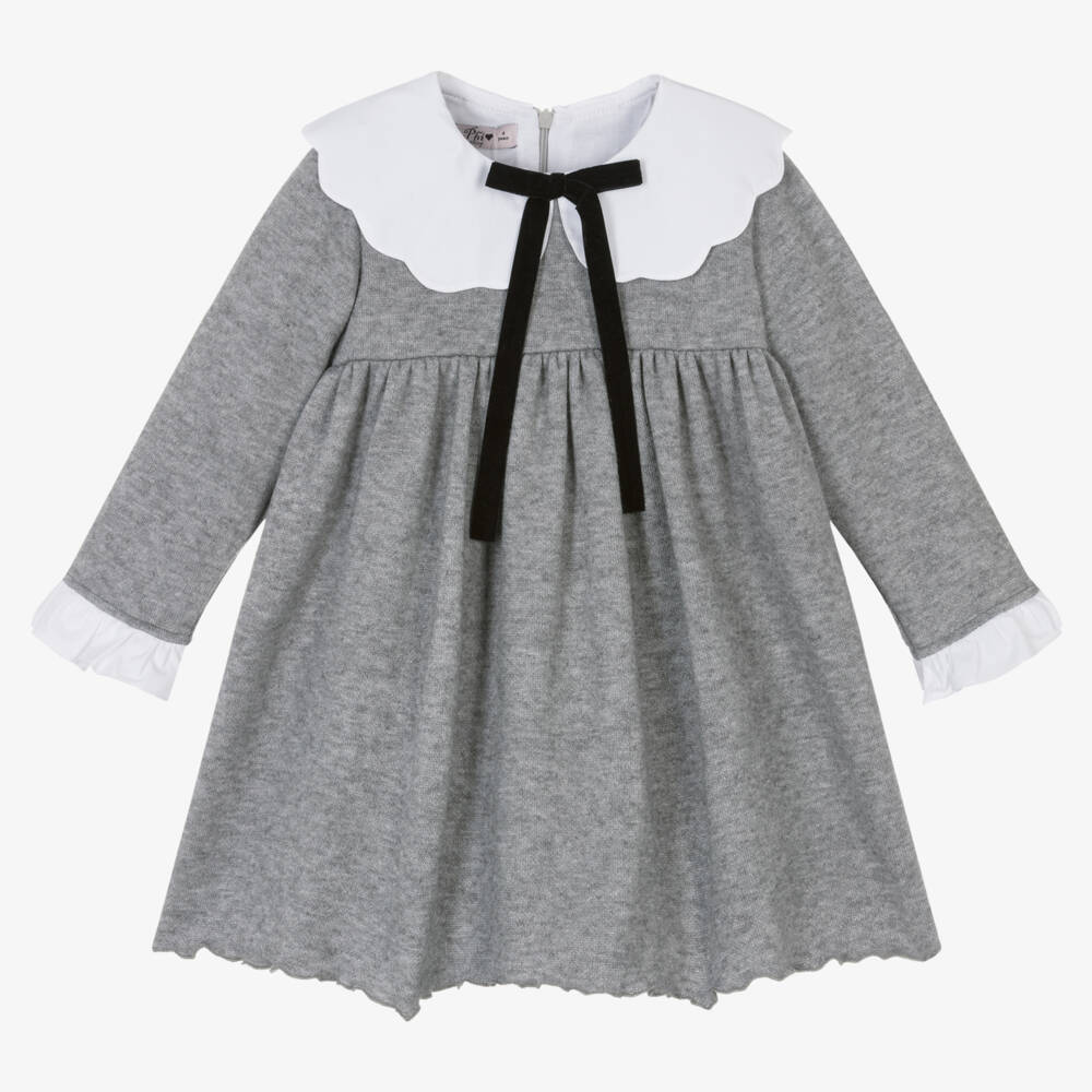 Knitted grey dress for girls by classic Portuguese brand Phi Clothing, with a scalloped white poplin collar, matching frilled cuffs and a fixed, black velvet bow. Just right for smart casual days, it is made in a super soft, comfortable viscose blend, with a cotton-lined bodice and a full, gathered skirt with a sweet, lettuce hemline. It fastens on the back with a neat, concealed zip.