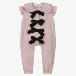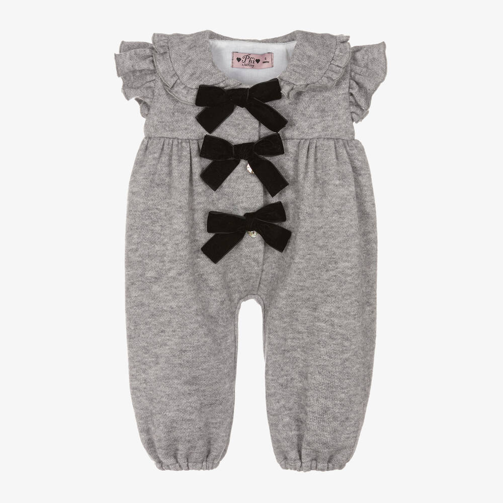 Smart grey jumpsuit for little girls by Phi Clothing, with fixed black velvet bows on the front. Knitted in a super soft viscose blend, the large collar has a frilly trim, there are sweet frills over the shoulders and the legs have gently elasticated cuffs. There are pretty, iridescent, mother-of-pearl button fastenings on the front and a voile lining on the bodice for comfort.