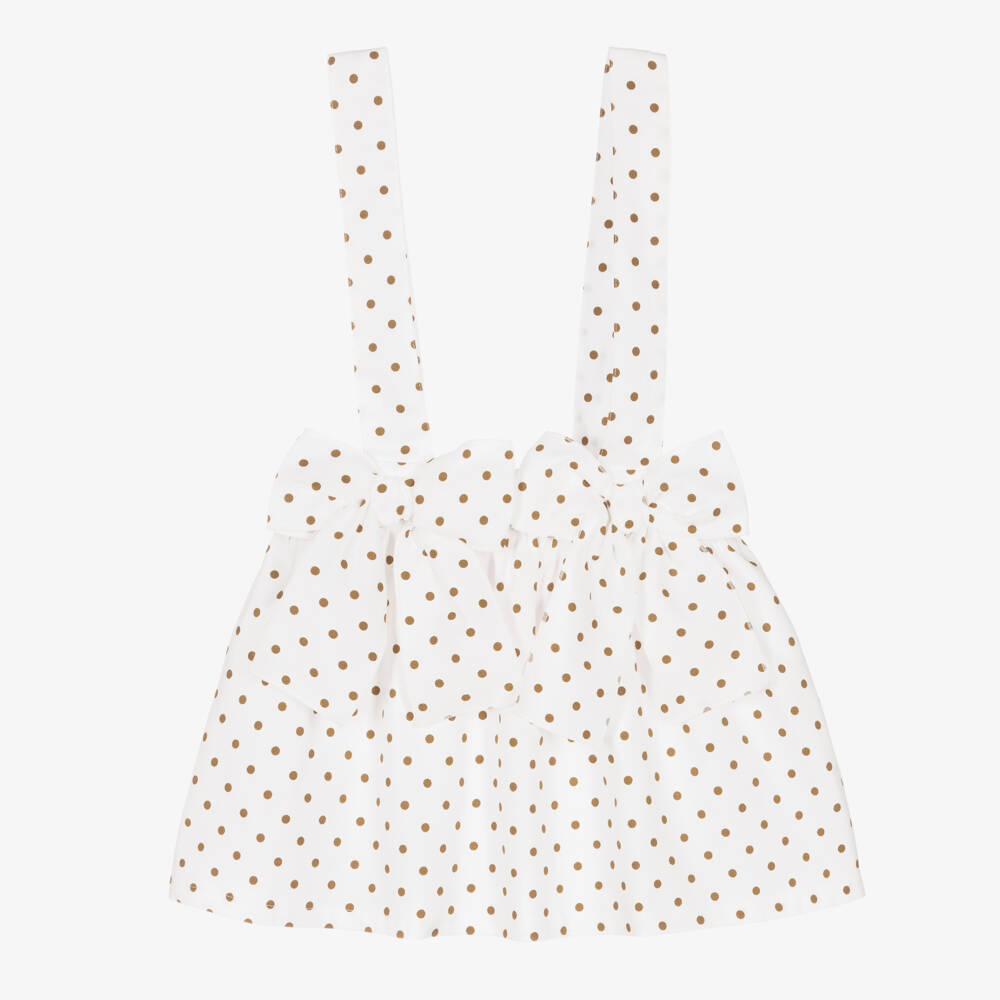 Cute ivory cotton skirt for girls by Portuguese brand Phi Clothing, made in lightweight poplin with a honeycomb pattern in the weave. It has a cute olive green polka dot print and large decorative red bows on the front. The skirt is full and gathered, with shoulder straps that fasten with buttons and a waistband that is elasticated around the back for comfort.