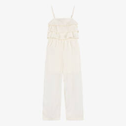 Charming ivory jumpsuit for little girls by Phi Clothing, with fixed red velvet bows on the front. Knitted in a super soft viscose blend, the large collar has a frilly trim, there are sweet frills over the shoulders and the legs have gently elasticated cuffs. There are pretty mother-of-pearl button fastenings on the front and a voile lining on the bodice for comfort.