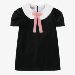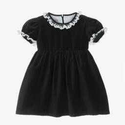 Sweet and stylish, this ivory sleeveless dress for girls is by Phi Clothing. Made from soft cotton velvet with a lightweight lining, it has contrasting black velvet appliqué bows on the front for a chic finish. With a lovely A-line silhouette, it has a pretty ruffled hemline and fastens neatly with a concealed zip on the back.