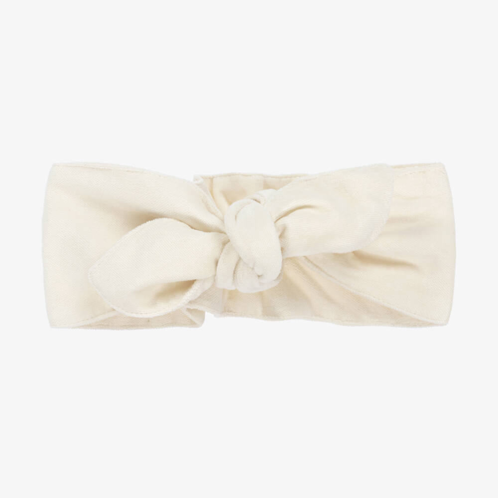 Pretty ivory tie-up headband for girls by Phi Clothing. Made in beautifully soft cotton velvet, it has a stretchy elasticated panel on the back for a cute and comfortable fit.