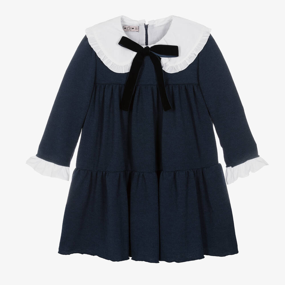 Navy blue dress for girls by Portuguese brand Phi Clothing, made in a beautifully soft jersey knit. Comfortably styled with a gathered, tiered skirt, this long-sleeved dress has a ruffle-trimmed, white poplin collar, with matching cuffs. There is a decorative velvet bow on the front to complete the classic look. Lined for comfort in soft cotton, this traditional dress fastens neatly with a concealed zip on the back.