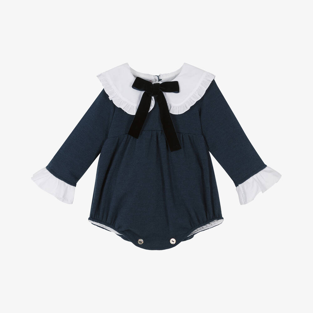 Navy blue shortie for little girls by Phi Clothing, made in a soft knit with contrast white trims. This classic babysuit has fluted cuffs and a scalloped collar, trimmed with a velvet bow appliqué. Lined in soft cotton voile, it fastens with iridescent mother-of-pearl buttons on the back and between the legs.