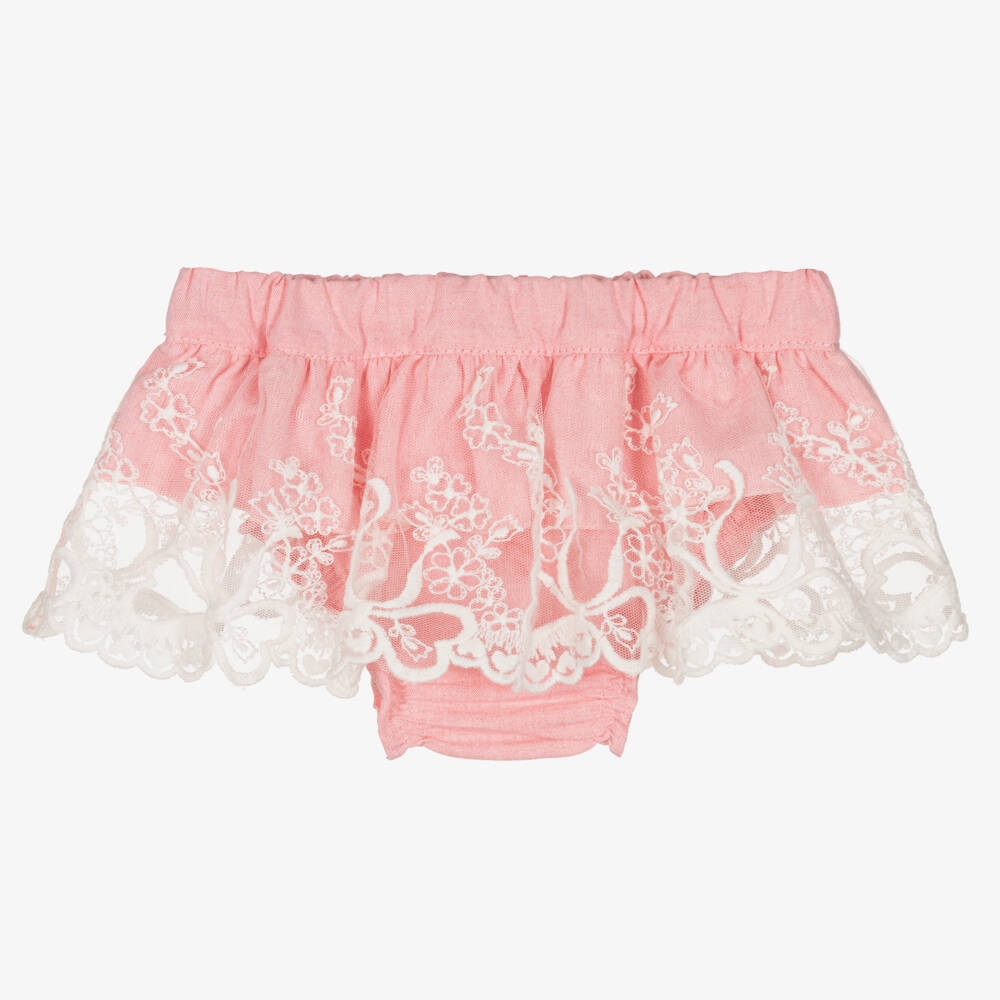Super cute cotton-blend bloomer shorts for little girls by Phi Clothing, in a pretty shade of rose pink. Trimmed with a ruffle, with a white lace ruffle on top, these traditional knickers have a romantic bow appliqué on the back. They have a comfortable, elasticated waist and frilled, gently elasticated leg cuffs.