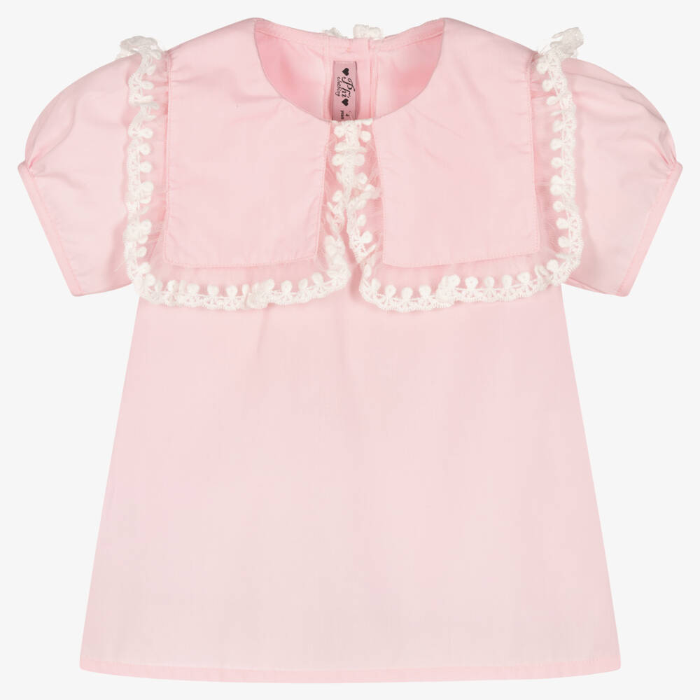 Girls pink blouse from Phi Clothing, made in lightweight cotton poplin. Fastening with traditional mother-of-pearl buttons on the back, this feminine style has an oversized square collar with pretty embroidered tulle trim and sweet puffed sleeves.