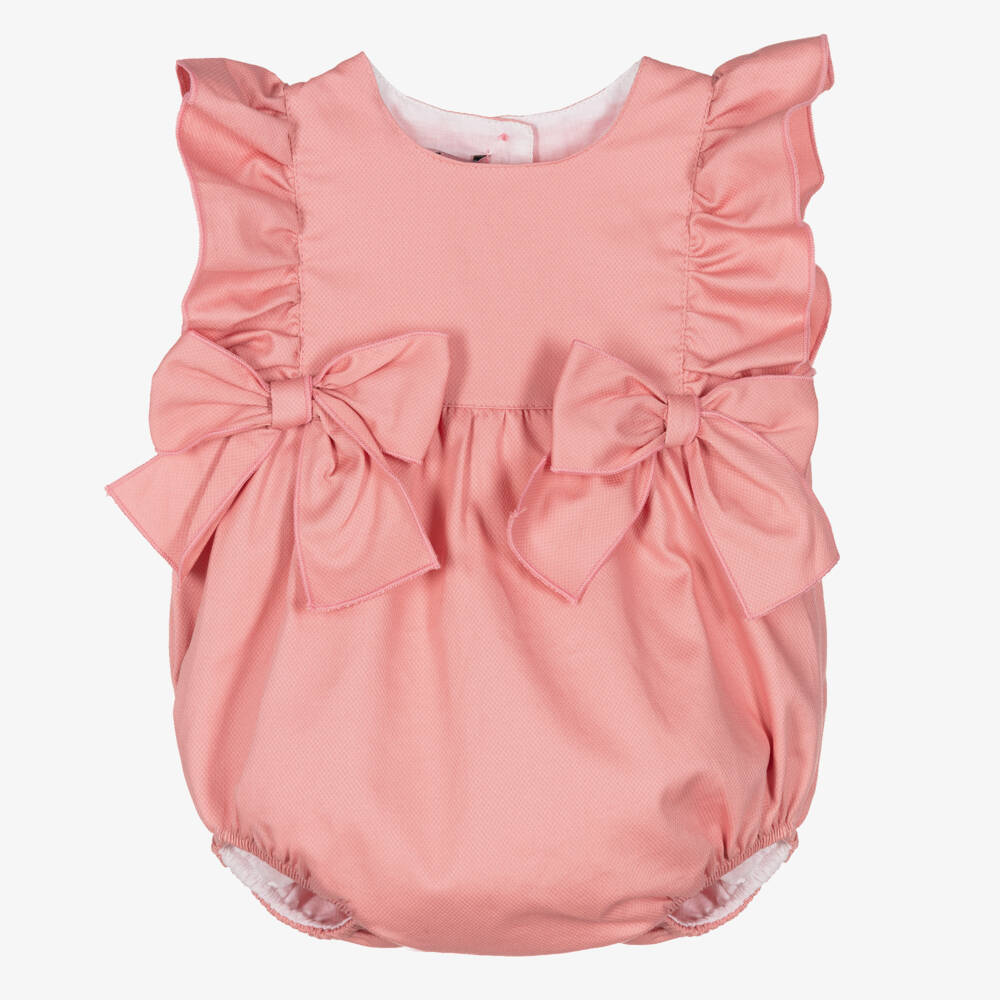 Pretty pink shortie for little girls by Phi Clothing, made in a soft cotton honeycomb weave. Decorated with romantic bows on the front, it has ruffles over the shoulders and an adorable bubble shape. Fully lined in cotton voile for comfort, it has comfortable elasticated leg cuffs and mother-of-pearl button fastenings on the back and between the legs.
