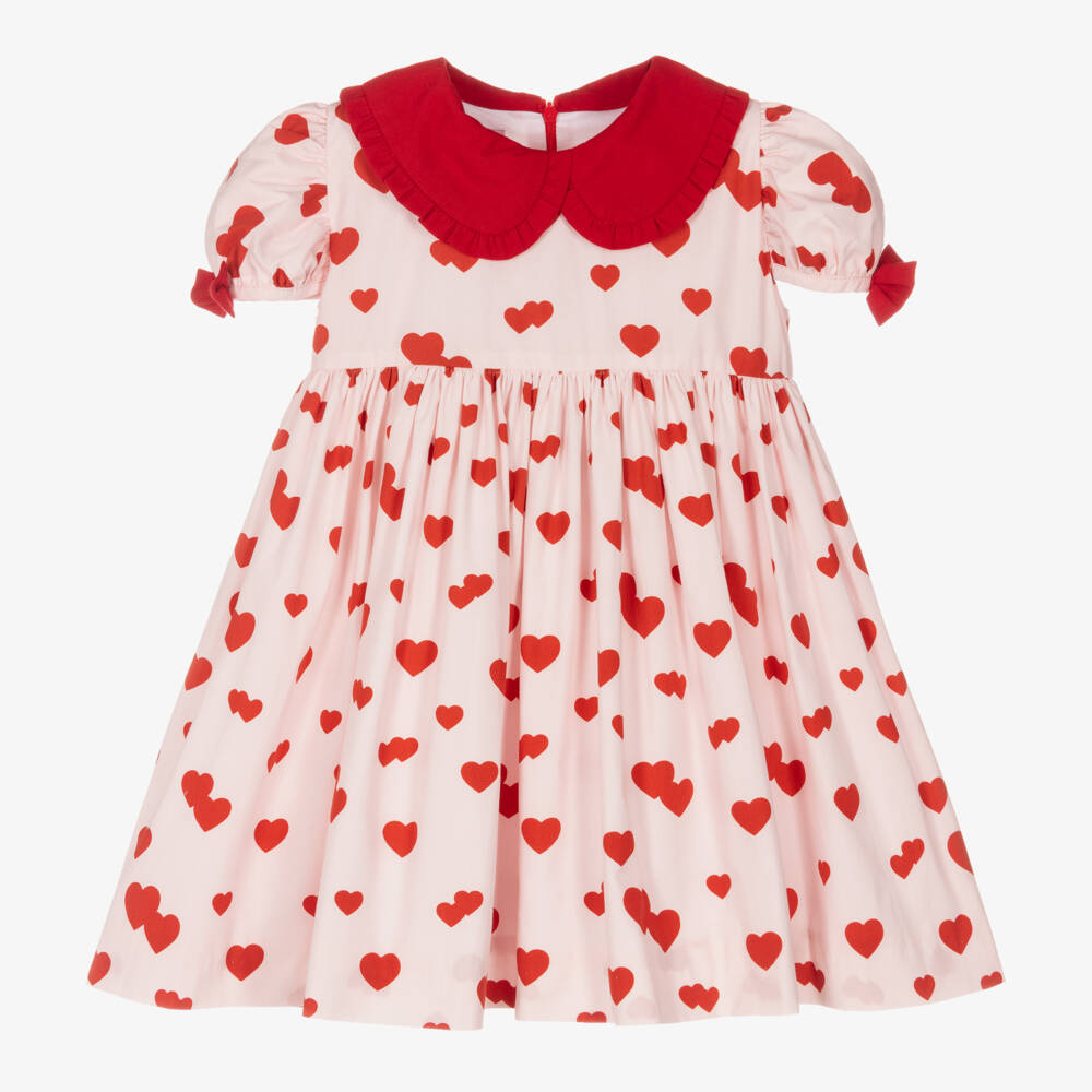 Pretty pink and red dress for girls by Phi Clothing, woven in lightweight, lined cotton. Patterned in a fun red heart print all-over, it has a red rounded collar with frilled trims and puffed bow sleeves. It has a full, flared shape for a romantic silhouette and smoothly fastens with a concealed zip on the back.