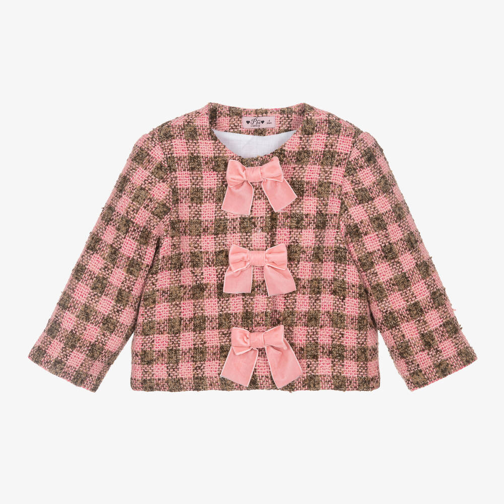 Pretty pink tweed jacket for girls by Phi Clothing, softly woven in a viscose-blend. Patterned in a beige check, this chic layering piece has velvet bow appliqués on the front and fastens with concealed poppers. It is lined for lasting comfort.