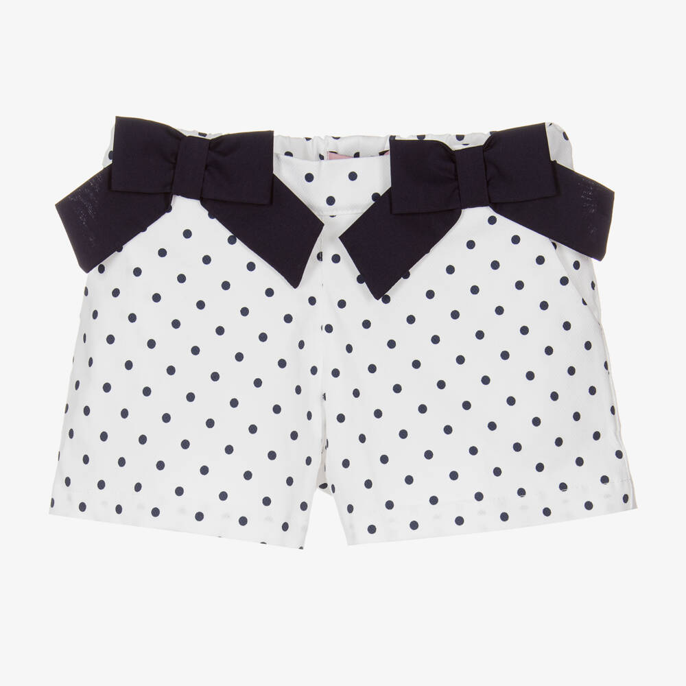 Stylish white shorts for girls by Phi Clothing, made in a diamond weave stretch cotton fabric. With an elasticated waist, they have an all-over navy blue polka dot pattern, side pockets and navy blue fixed bows on the front for a pretty look.