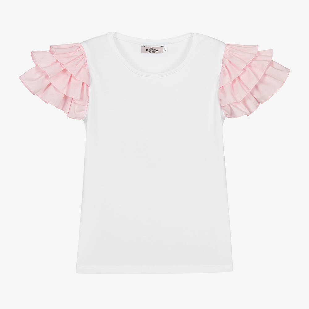 Pretty white T-shirt for girls by Phi Clothing, made in soft and stretchy cotton jersey. Comfortable and easy wearing, it has short sleeves made in layers of pink ruffled cotton poplin for a statement girly finish. Smaller sizes have popper fastenings on the back.