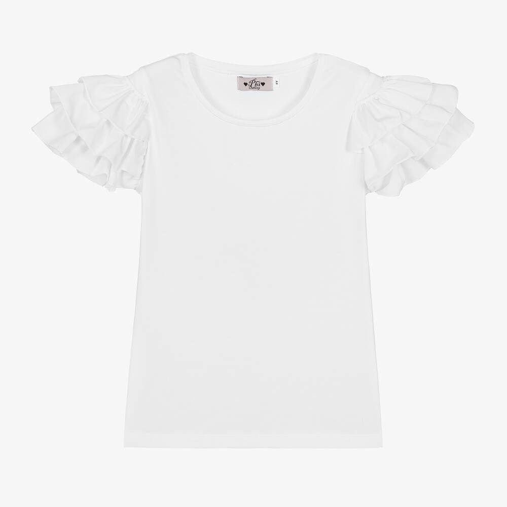 Pretty white T-shirt for girls by Phi Clothing, made in soft and stretchy cotton jersey. Comfortable and easy wearing, it has short sleeves made in layers of white ruffled cotton poplin for a statement girly finish. Smaller sizes have popper fastenings on the back.