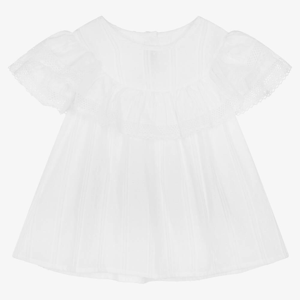 Lovely white blouse for girls by Phi Clothing, made in lightweight plumeti cotton. Classically styled, it has sparkly silver thread in the weave and a large frill around the bodice, edged with delicate lace. There are matching, gathered angel sleeves and a single button fastening around the back.