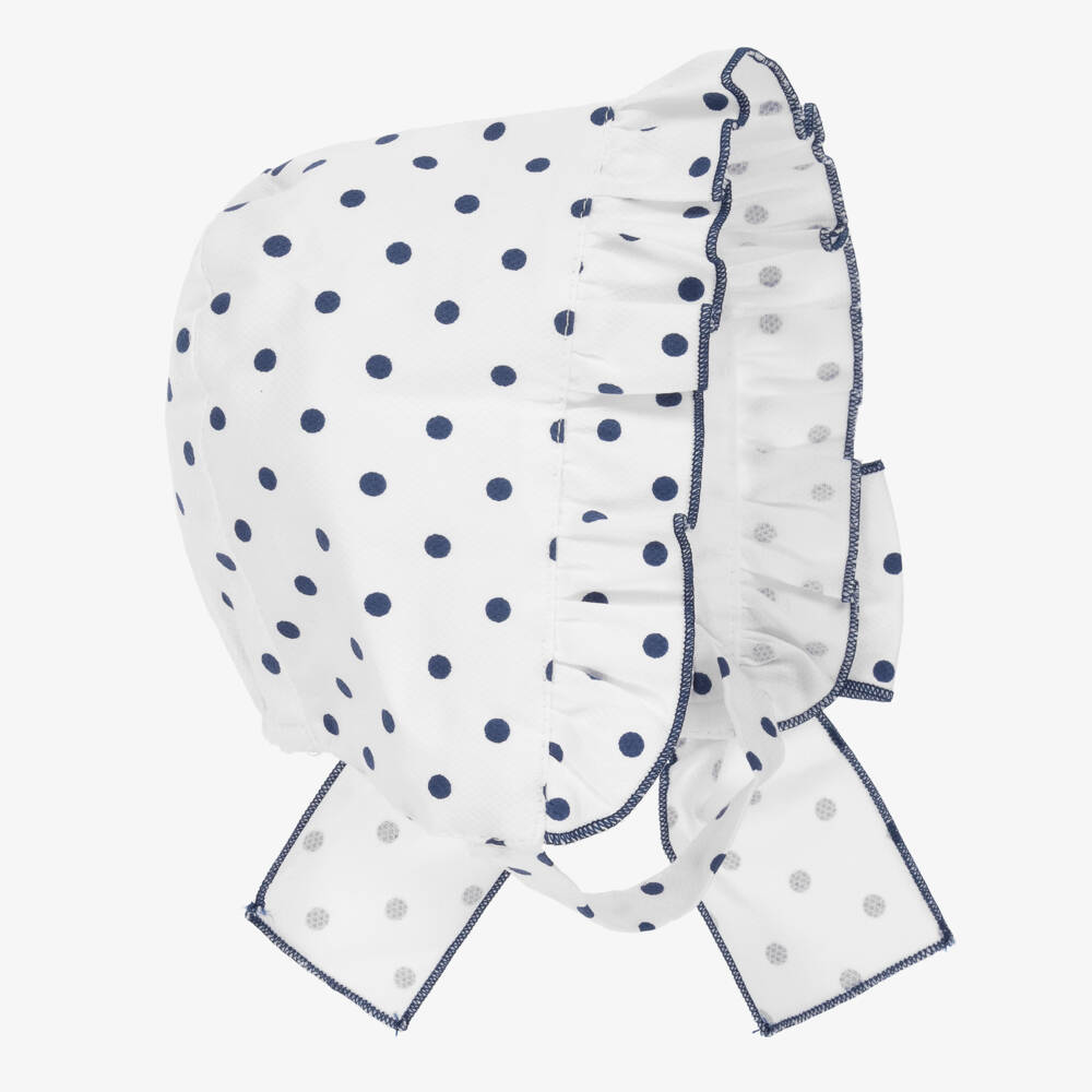 Lovely white bonnet for little girls from Phi Clothing, made in soft cotton with a woven diamond design. Securing under the chin with a button fastening strap, this pretty bonnet has an all-over navy blue polka dot pattern, with a romantic ruffle trim and a large fixed bow on one side.