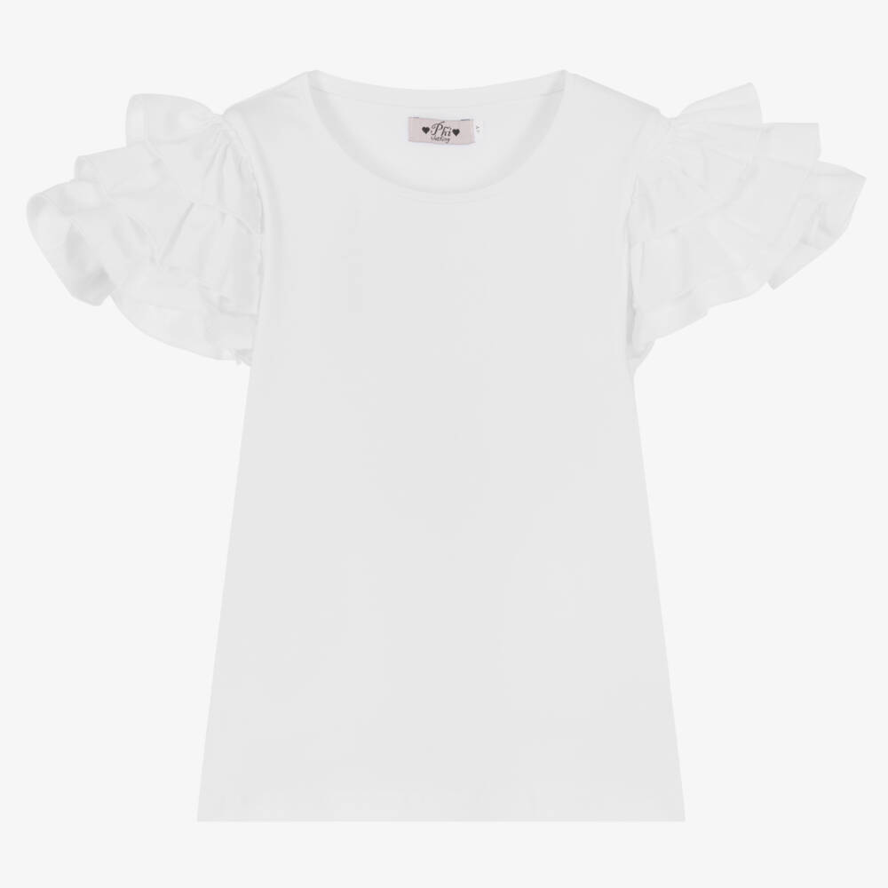 Girls white cotton T-shirt by Phi Clothing. In the brand's trademark style, it has dramatic ruffle sleeves for a statement feminine look.