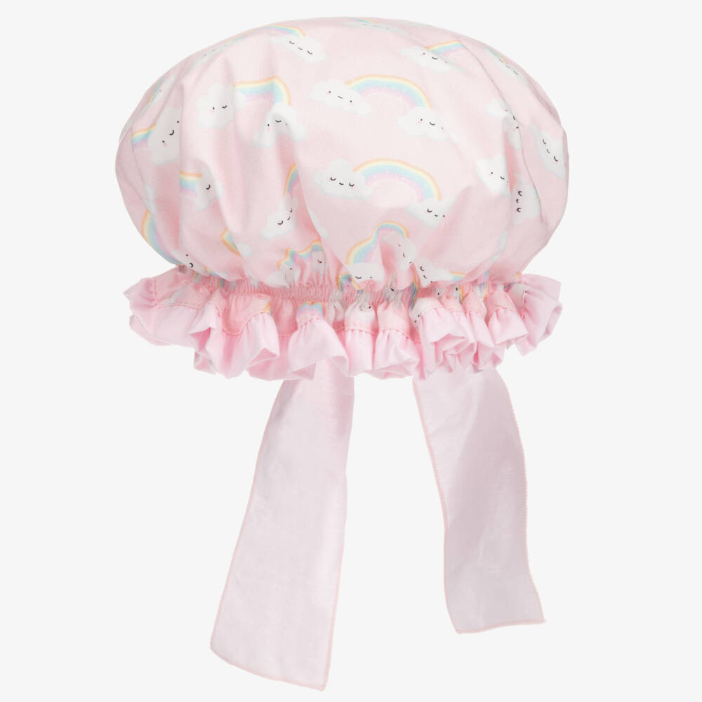 Younger girls pink cotton hat by Phi Clothing, with an elasticated brim. The soft and lightweight fabric has a cute rainbow cloud print and a ribbon tie on the back.