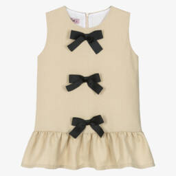 Younger girls burgundy red pinafore dress by Phi Clothing. Made with soft cotton velvet, this sweet dress has concealed button-fastened shoulder straps and a fixed bow on the elasticated back.