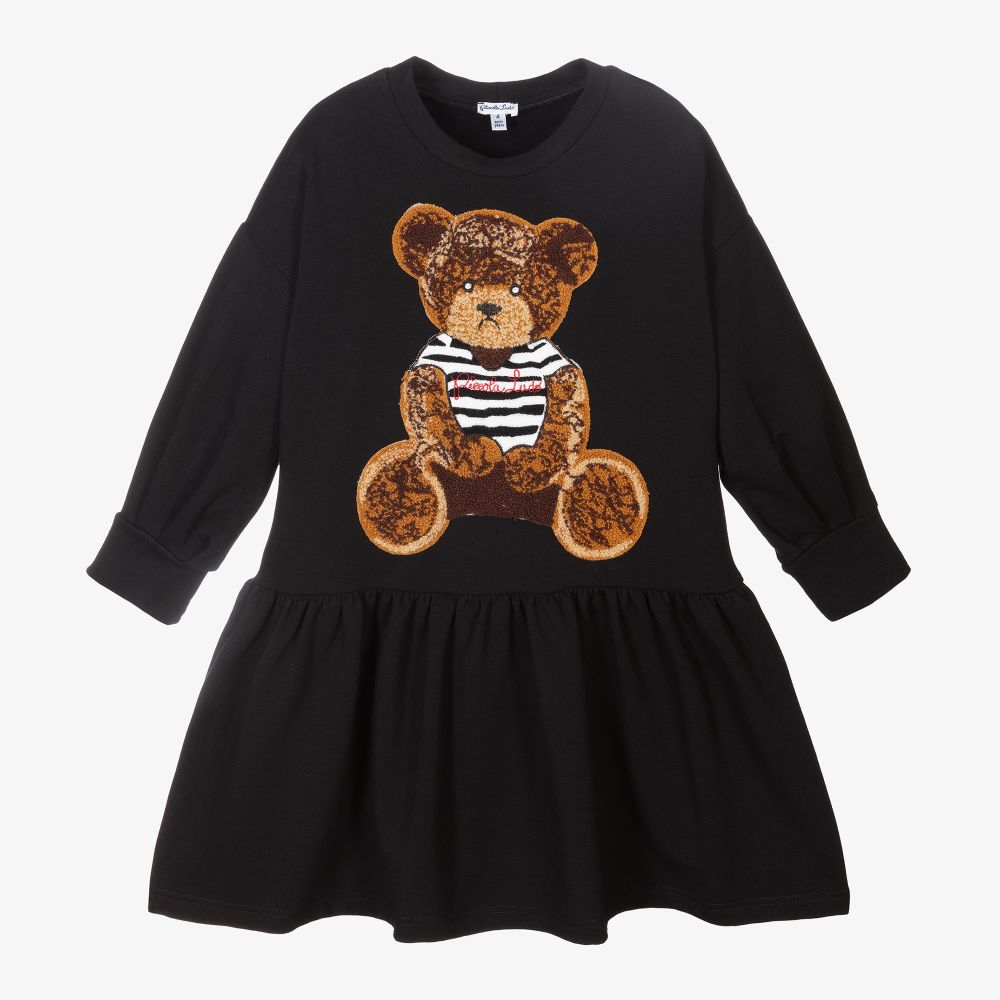 Girls black dress by Piccola Ludo, made in soft sweatshirt jersey with a fleecy inside. There is a large teddy bear motif appliqué in brown towelling on the front and a ruffled hemline.