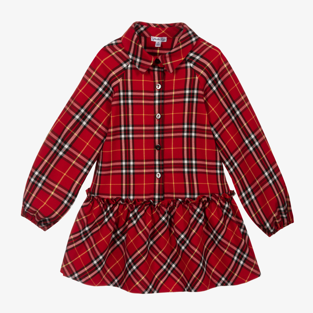 Red dress for girls, by Piccola Ludo. Made from soft mid-weight twill, it has a smart red and white check design all-over, with a pretty ruffle trimmed skirt.