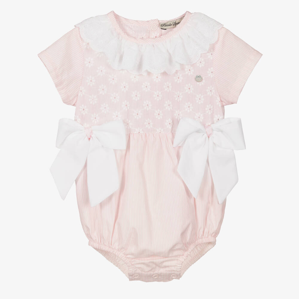 In a fine pale pink stripe with a white ruffle collar, this charming cotton shortie for baby girls is by Piccola Speranza. The bodice and collar are beautifully patterned in white floral embroidery, with stand-out white bows on the front. Fastening easily with poppers, this delightful babysuit is partially lined in lightweight cotton voile and is gently elasticated around the legs for comfort.