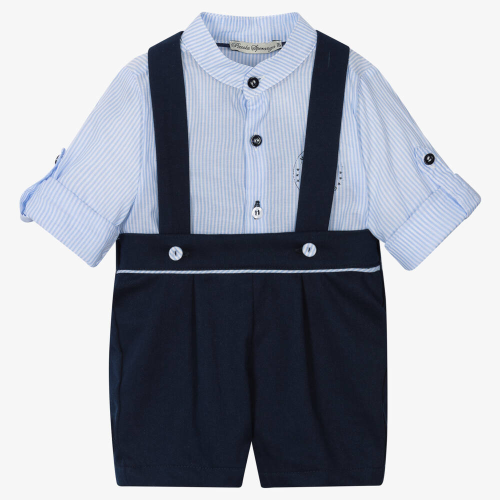 A traditional shirt and shorts set for little boys by Piccola Speranza, made in soft cotton. The lightweight collarless shirt is in a pale blue and white stripe, with a slogan print on the chest. The long sleeves can be turned up and secured in place with a button tab. The navy blue shorts are woven in soft will and have matching striped trims. There are attached straps that fasten with buttons at the front, and the waist is gently elasticated around the back.