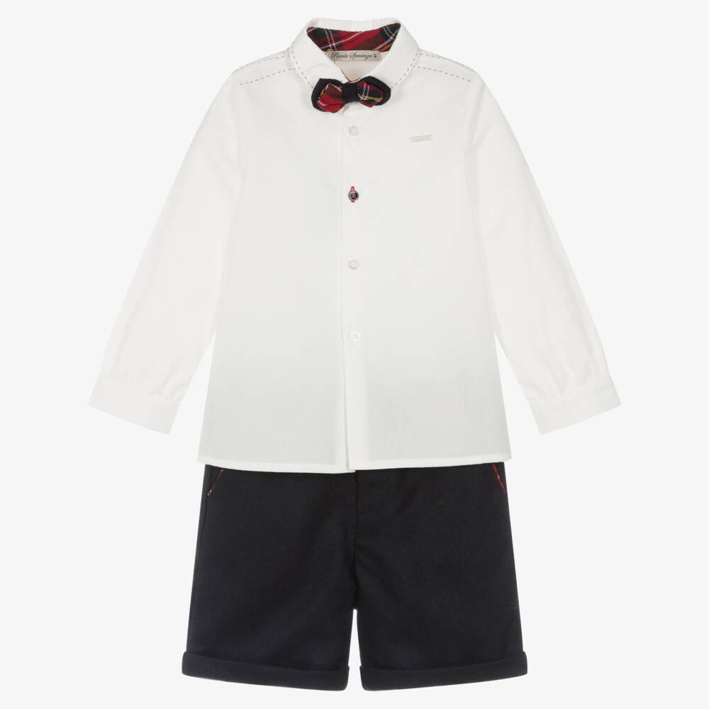 White and navy-blue shorts set for little boys by Piccola Speranza. The shirt is made in soft poplin, with white and blue front button fastenings, a pearlescent logo plate on the chest and printed 'stitching' on the shoulders and collar for a classic look. Made in a brushed wool blend, the coordinating shorts have red tartan trims on the pockets, an adjustable waist for a secure fit, and fixed turn-up cuffs. They fasten with a front button and zip and are lined with lightweight cotton voile for comfort and breathability. Included is an elasticated tartan bow tie, with an adjustable, clip-fastening strap for the ideal fit.