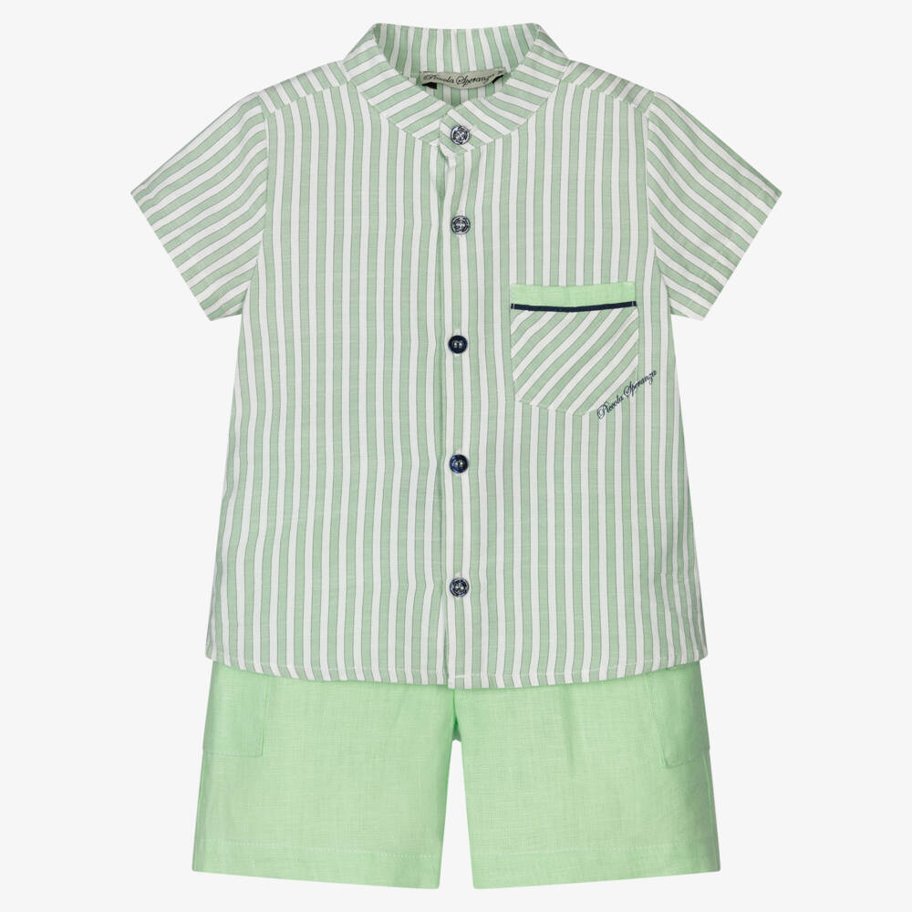 Casual and comfortable two-piece shorts set for boys by Piccola Speranza. The linen shorts have button fastening flap pockets at the sides, with an elasticated waist with a navy blue drawstring. The collarless striped shirt is made in lightweight cotton and has front button fastenings. There is matching linen trim on the chest pocket, with the brand's logo name printed below.