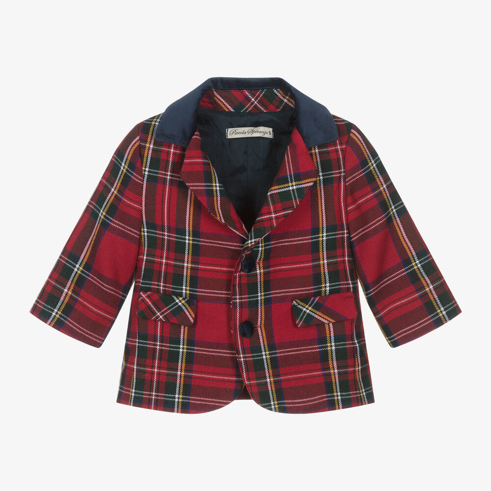 In a classic red tartan check, this smart blazer for boys is by Portuguese brand Piccola Speranza. It is woven in soft twill fabric, with a navy blue velvet trim on the collar. Lined in silky satin, it has faux pockets and velvet-covered button fastenings on the front.