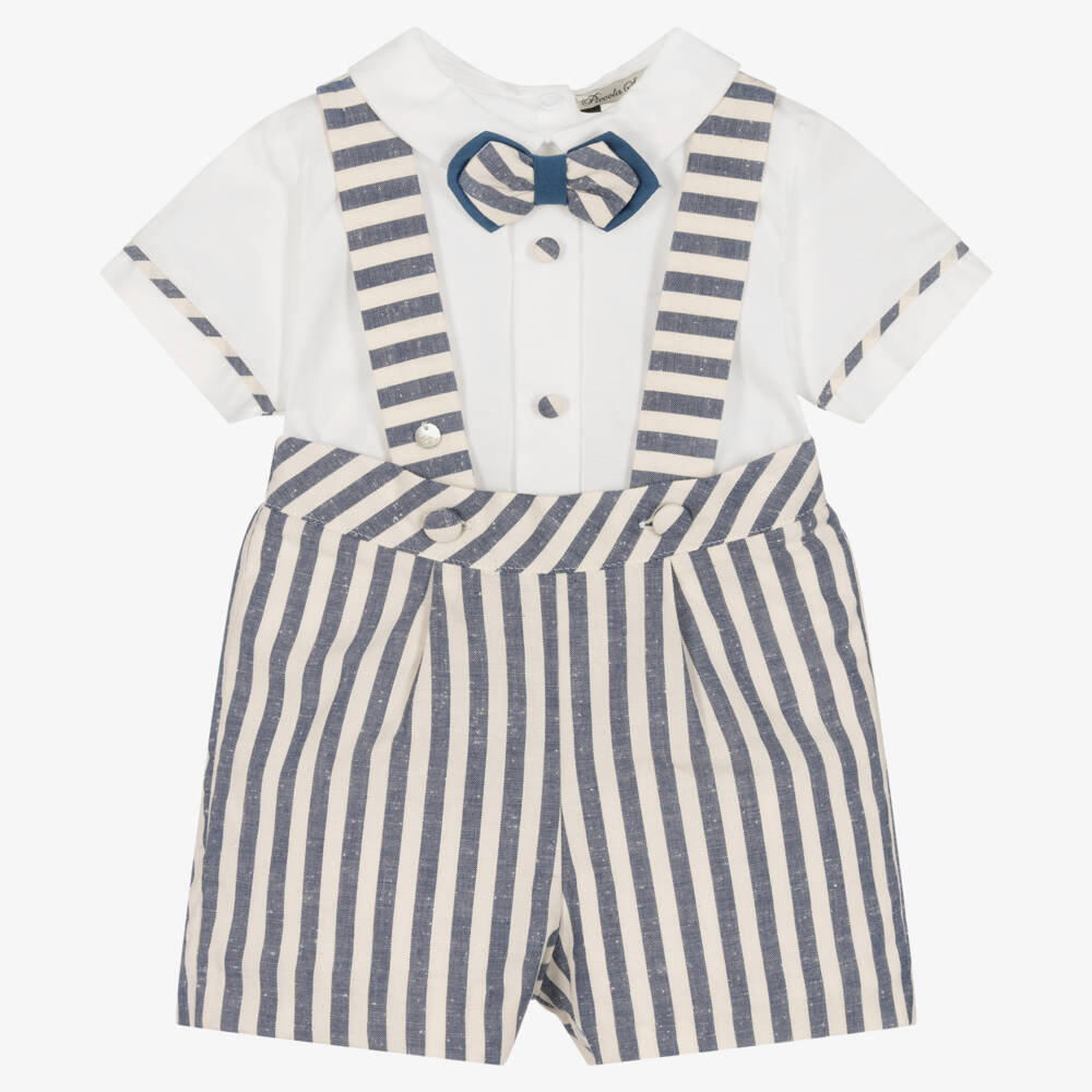 White and navy blue striped shorts set for little boys by Piccola Speranza. Made in organic cotton and fully lined, the shorts have adjustable button-fastening shoulder straps and a comfortable elasticated waistband. The smart white cotton shirt has decorative covered buttons on the front and trims to match the shorts. It fastens with poppers on the back and comes with a cute bow tie to complete the look.