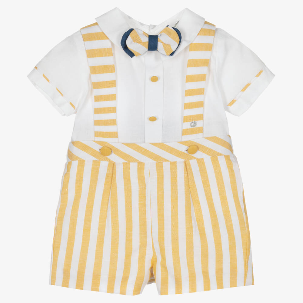 White and yellow striped shorts set for little boys by Piccola Speranza. Made in a lightweight linen and cotton blend and fully lined, the shorts have adjustable button-fastening shoulder straps and a comfortable elasticated waistband. The smart white cotton shirt has decorative covered buttons on the front and trims to match the shorts. It fastens with poppers on the back and comes with a cute bow tie to complete the look.
