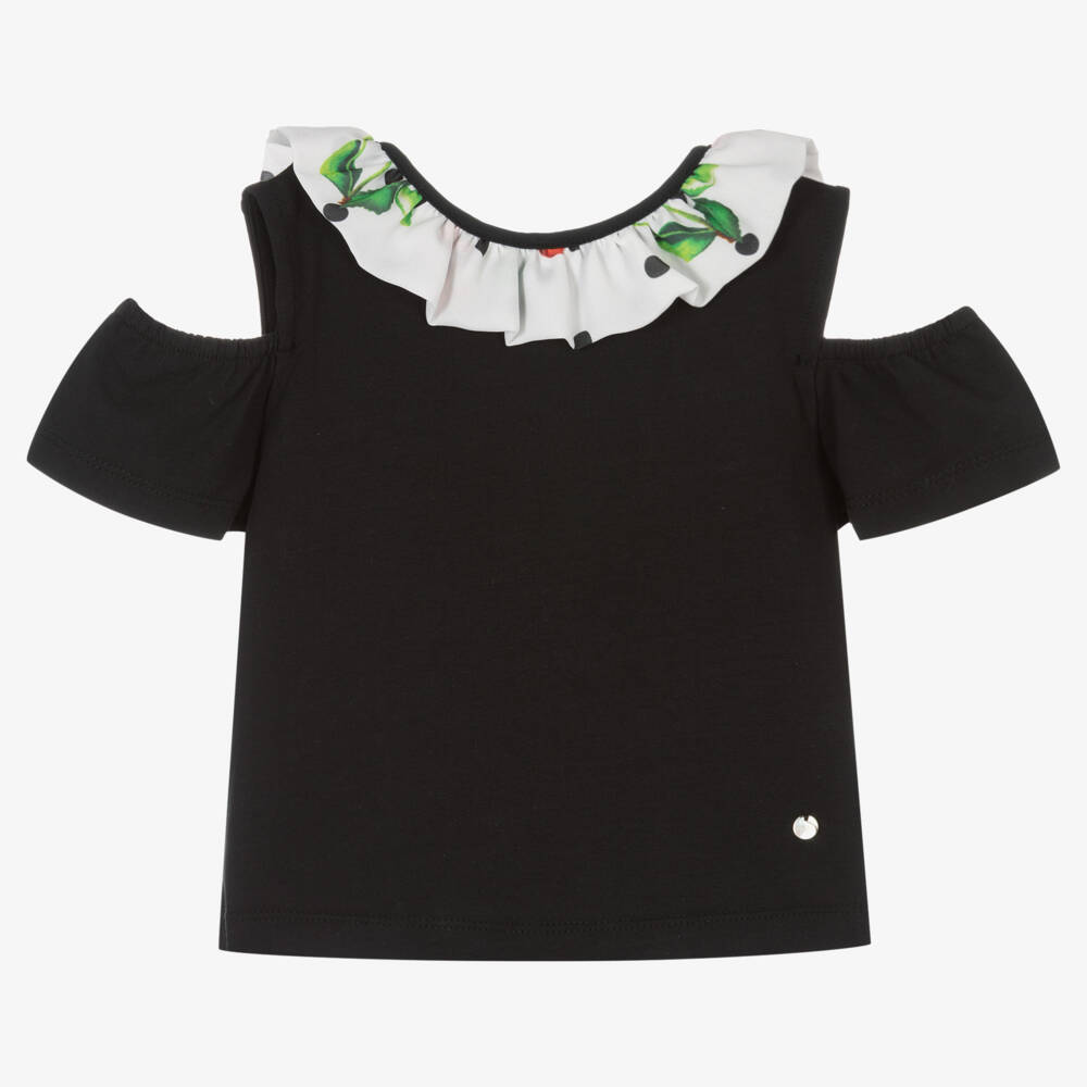 Chic black cotton top for girls from Piccola Speranza, with elasticated cold-shoulder detailing. This stylish top has white chiffon trims on the front that form a large bow on the back, patterned with cherries and polka dots.