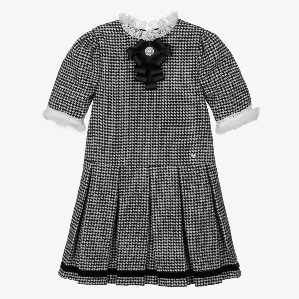 Super smart black and white houndstooth dress for girls by Portuguese brand Piccola Speranza, ideal for a special occasion. It has an elaborate, black grosgrain brooch on the front with a central pearl surrounded by diamantés, and a stand-up, white lace collar. The puffed sleeves are trimmed in shimmering sequins and white faux fur, whilst the pleated skirt has a mother-of-pearl logo charm and a black velvet trim. The dress is lined in black satin for comfort and fastens with a discreet, concealed zip around the back.
