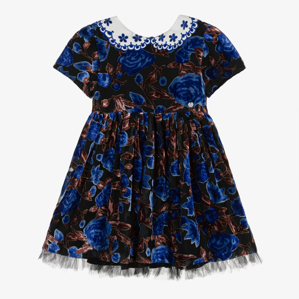 Lovely blue floral dress for girls by Piccola Speranza. Made in luxuriously soft devoré velvet, this beautiful dress has a blue floral pattern on a sheer background and ruffled tulle trim on the hem. For a traditional look, it has a pretty broderie anglaise collar trimmed in blue. Fastening neatly at the back with a concealed zip fastening, it is fully lined in a lightweight viscose for all-day comfort.