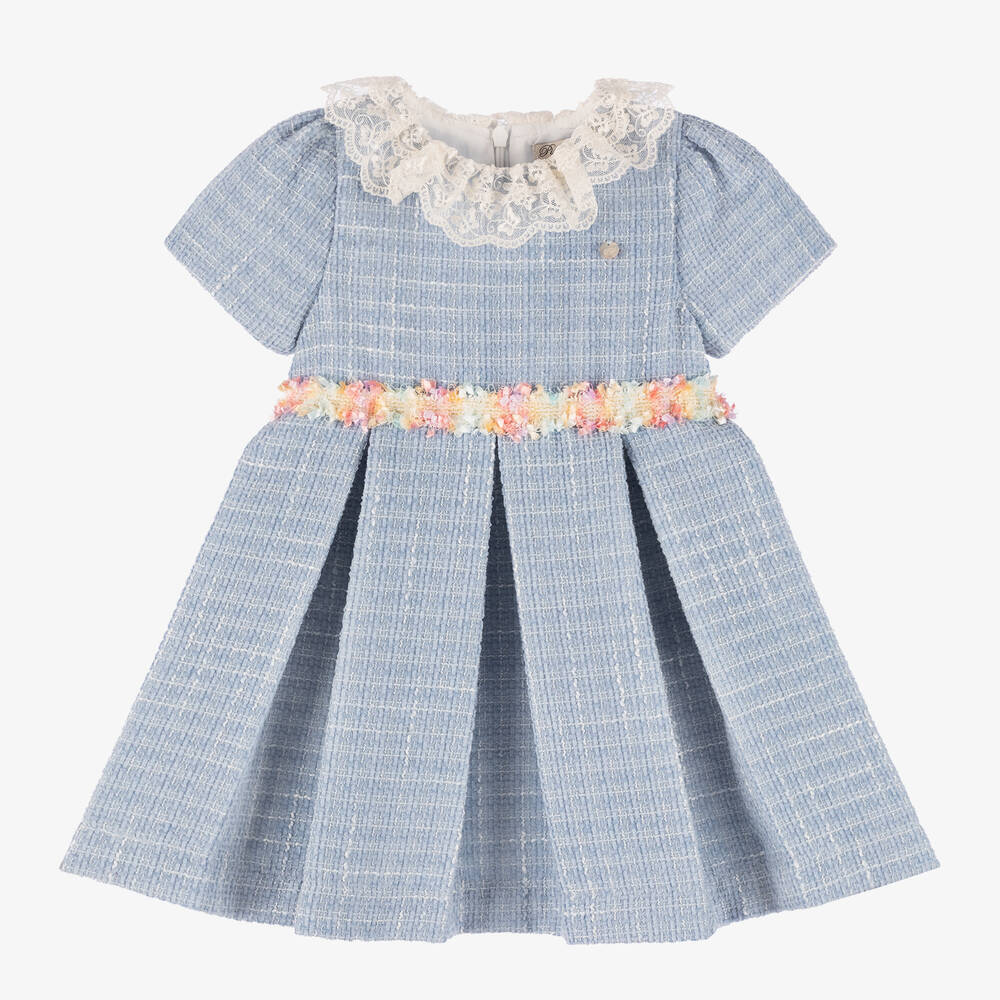 Lovely blue short-sleeved dress for younger girls by Piccola Speranza, made in soft tweed. Traditionally styled with a delicate lace ruffle collar, this sweet dress is trimmed around the waist with little satin ribbons in beautiful pastel shades. It has a full, pleated skirt and is lined in soft cotton for lasting comfort, with a concealed zip fastening on the back.