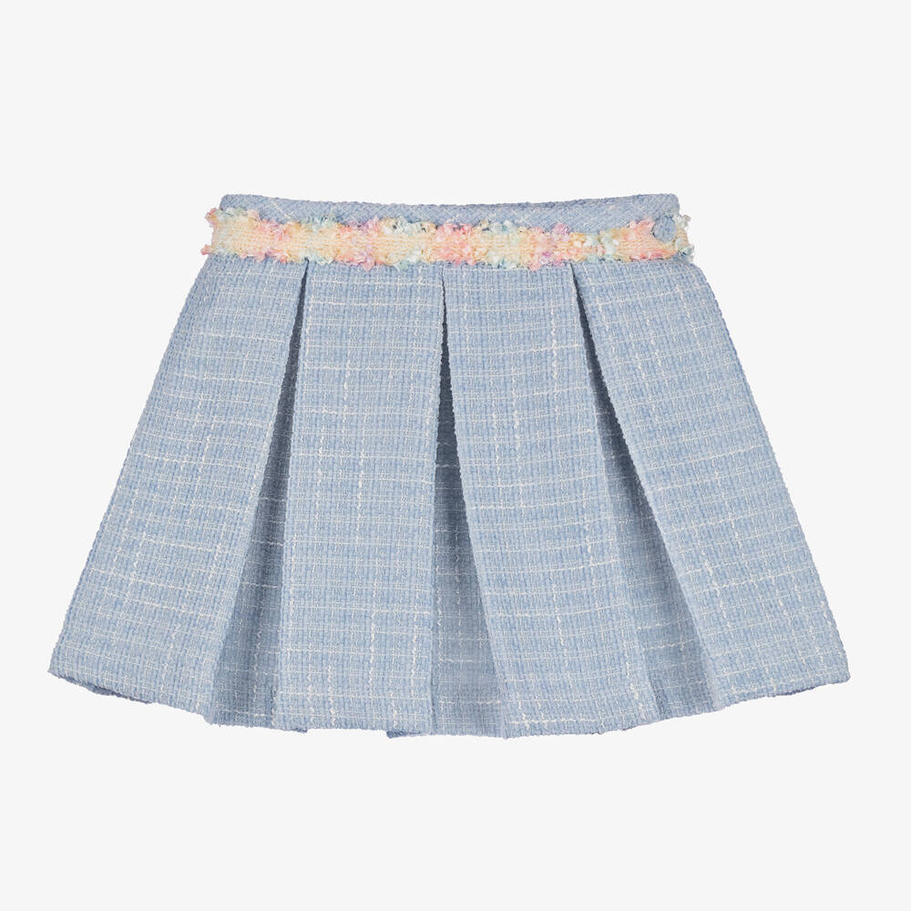 A stylish blue skirt for girls by Piccola Speranza, made from soft, mid-weight tweed. In a pleated design, this pretty skirt is decorated around the waist with delicate satin ribbons in beautiful pastel shades. It has a lightweight cotton lining for comfort, with a concealed zip and button fastening on one side and an adjustable waistband to ensure a great fit.