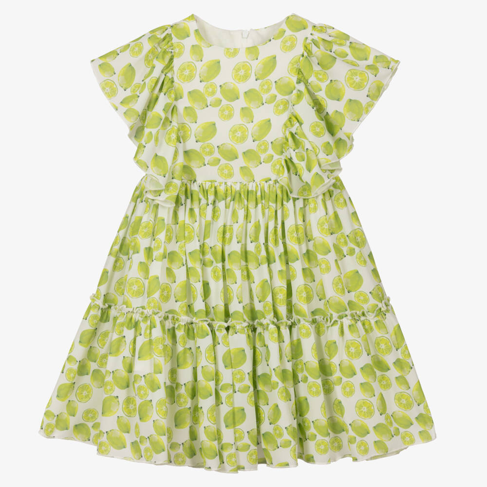 Summery green lime print dress for girls by Piccola Speranza, made in lightweight chiffon. Wonderfully feminine, it has frilly capped sleeves and a skirt that gathers in tiers for a flowing look. It fastens effortlessly with a concealed zip on the back and is lined with cotton voile, offering superior comfort.