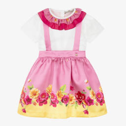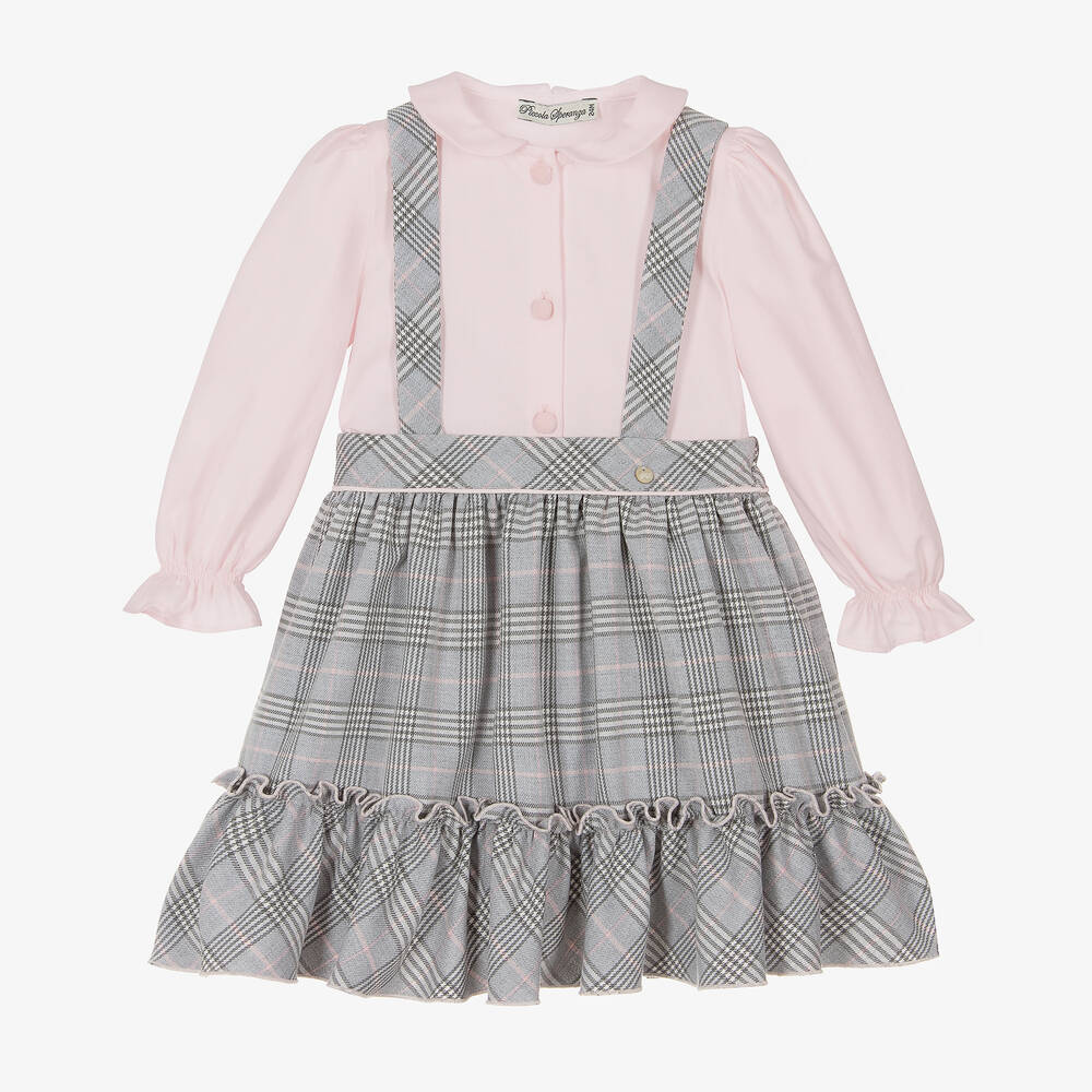 Smart pale grey and pink tartan skirt set for girls by Portuguese brand, Piccola Speranza. The pink cotton twill shirt has long, puffed sleeves with frilled, gently elasticated cuffs and velvet button fastenings on the front. Made in soft twill, the gathered, tartan skirt has pretty pink piping and a mother-of-pearl logo charm sewn on the part-elasticated waistband. There are adjustable shoulder straps, a deep frill around the hemline and a lightweight cotton voile lining for comfort.